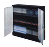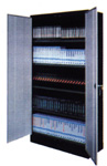 Capacité d'environ 30 cassettes vidéo par tablette (dépendamment de la dimension de celle-ci). Tablettes de 88.3 x 33 cm (35-5/16" x 13-3/16"). Cabinet de 92.5 x 36.3 x167.5 cm (37" x 14-1/2" x 67"). Couleur mastic.