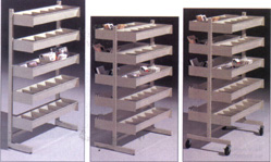 Bacs et tablettes média- Tablettes inclinées à 45° avec bacs détachables. Les bacs on six séparateurs permettant de placer divers média en rangées. Tablettes en acier 18 millièmes fixées à des agrafes en acier 14 millièmes. Les tablettes s'accrochent dans les fentes des colonnes de soutien et s'ajustent à différentes hauteurs aux 2.5 cm (1").