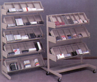 Disques compacts, vidéocassettes, livres de poche, bandes magnétiques et diverses cartouches informatiques. Unités de type cantilever, autonomes à tablettes multimédia en acier. Le système consiste en une unité de base à laquelle s'ajoute des sections de 91.5 cm (36"). Les unités sont disponibles en hauteurs de 106.7 cm (42") à 182.9 cm (72") en sections de 91.5 cm (36") à simple ou double face.