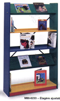 Numéro Description Hauteur Largeur Profondeur Prix Étagère ajustable M80-6231 Étagère de base 149.9 cm (59") 69.9 cm (27-1/2") 27.9 cm (11") $814.00 M80-6232 Tablette additionnelle de 69.8 cm (27-1/2") 25.4 cm (10") 66 cm (26") 2.5 cm (1") $76.00 M80-6233 Étagère de base 149.9 cm (59") 90.2 cm (35-1/2") 27.9 cm (11") $909.00 M80-6234 Tablette additionnelle de 90.2 cm (35-1/2") 25.4 cm (10") 86.4 cm (34") 2.5 cm (1") $96.00 Chariot à livres M80-6221 Chariot à livres 100.3 cm (12") 90.2 cm (35-1/2") 40 cm (15-3/4") $909.00 Bac juvénile mobile M80-6381 Bac juvénile mobile 30.5 cm (12") 59.7 cm (23-1/2") 59.7 cm (23-1/2") $503.00 Meuble à tiroir M80-6241 Meuble à tiroir 74.9 cm (29-1/2") 45.1 cm (17-3/4") 59.7 cm (23-1/2") $635.00