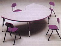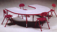 Cinq tables de formes différentes pour meubler votre centre d'apprentissage: rectangulaire, trapezoïdale, ronde, en U et en D. Dessus gris nébuleuse, en stratifié plastique haute pression fini moucheté de 3.2 cm (1.25") d'épaisseur. Contours de couleur, en vinyl résistant de 1.2 cm (0.4"), à coins et rebords arrondis.