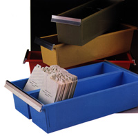 Classeurs pour fiches en trois couleurs attrayantes pour égayer le bureau de circulation. D'une seul pièce de polystrylène à haute résistance avec avant et arrière inclinés pour faciliter le classement. Pour fiches et séparateurs de 12.5 x 7.5 cm (5" x 3"). Avec butoir ajustable en acier.
