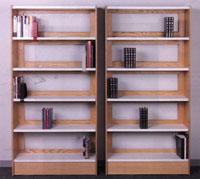 Panneaux: chêne. Tablettes: mélamine blanc ou chêne. 26.7 cm (10-1/2"). 5 tablettes (1 à la base + 4 autres ajustables de 3.2 cm (1-1/2") plus haut ou plus bas). Dimensions extériures: 183 x 91.5 x 30.5 cm (72" x 36" x 12").